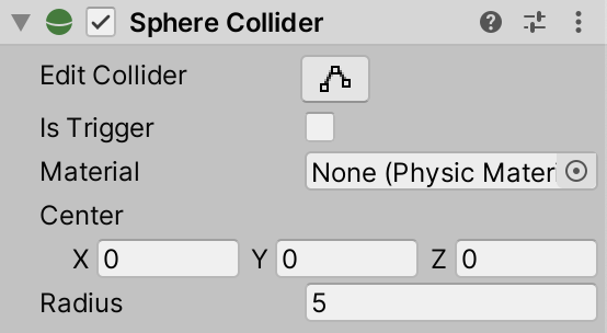 구 형태의 기본 Collider이며, 구 형태의 GameObject 뿐만 아니라 낙하는 하는 바위 및 굴러 떨어져야 하는 GameObject에도 유용하다.