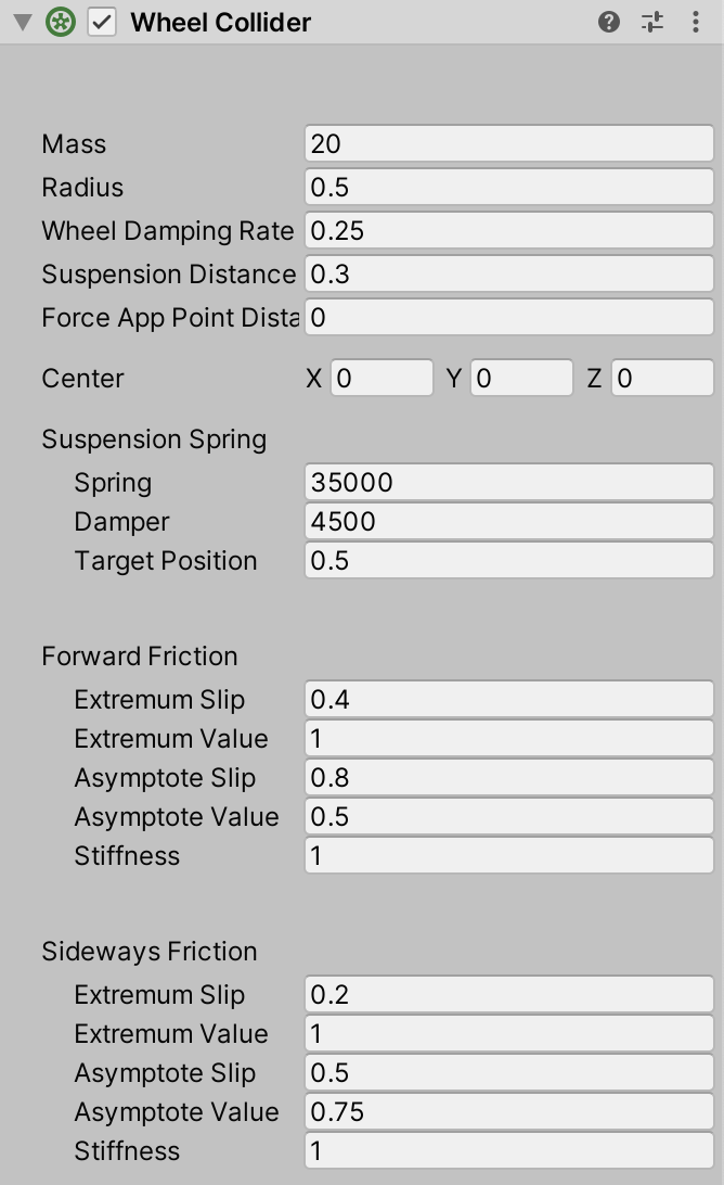 - Stiffness: 마찰의 강도. 0값은 Wheel의 모든 Friction이 사라진다.
