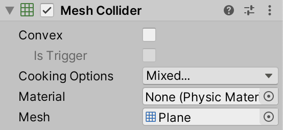 Convex: 선택 시, 다른 Mesh Collider와 충돌한다. Convex mesh collider는 255개의 triangle로 제한된다.