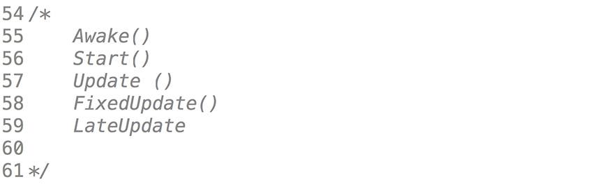 LateUpdate: Update와 비슷하나, 프레임 끝에 호출되는 함수. (예: 게임 캐릭터를 이동시키려는데 다른 캐릭터와 부딪혀 의도하지 않은 위치로 움직이는 경우, 카메라를 캐릭터와 동시에 움직이면 흔들림이 발생하고 카메라가 원래 있어야 할 자리로 이동하지 않는 경우에 유용하게 사용됨) 별도의 Loop 처럼 작동하여 유용하게 사용될 수 있음.