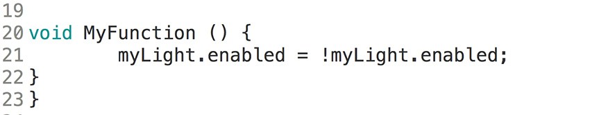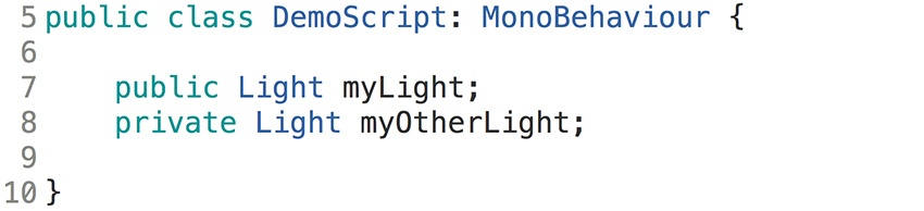 변수를 정의할 때 중요한 또 한가지 요소는 Type이다. Type은 변수가 메모리에 포함하는 값의 종류를 정의한다. (위의 이미지에서 myLight 변수는 Light 타입으로 정의 됨)
